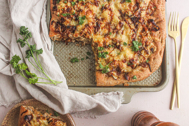 Une recette de focaccia faite à partir de farine de blé d'ici, avec une garniture aux oignons caramélisés et au fromage. Cela donne un heureux mélange entre un classique italien et le goût réconfortant de la tarte à l’oignon qu’on aime tant!