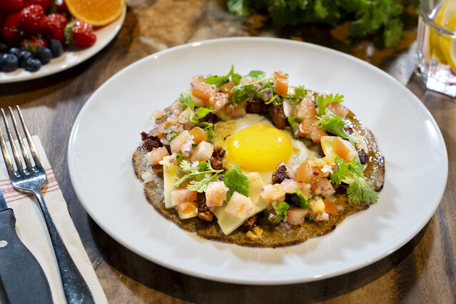 Dans chaque assiette, déposer une galette chaude à plat. Ajouter l’œuf miroir au centre. Répartir tout autour la chair à saucisse rôtie, les morceaux de cheddar en copeaux (qui fondront légèrement), et une généreuse cuillère de pico de gallo. Terminer avec de belles feuilles de coriandre fraîche.