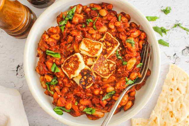 Mijoté tomaté aux haricots blancs et fromage halloumi