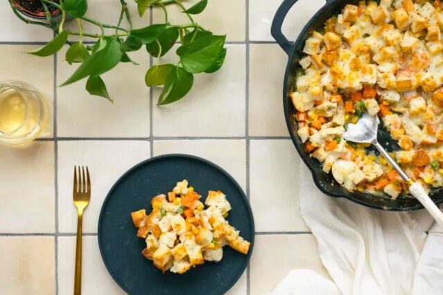 - Transférer le mélange de tofu dans un plat de cuisson allant au four. Garnir des croûtons et du fromage. Cuire au four 5 minutes, puis faire griller (à broil) 2 ou 3 minutes.