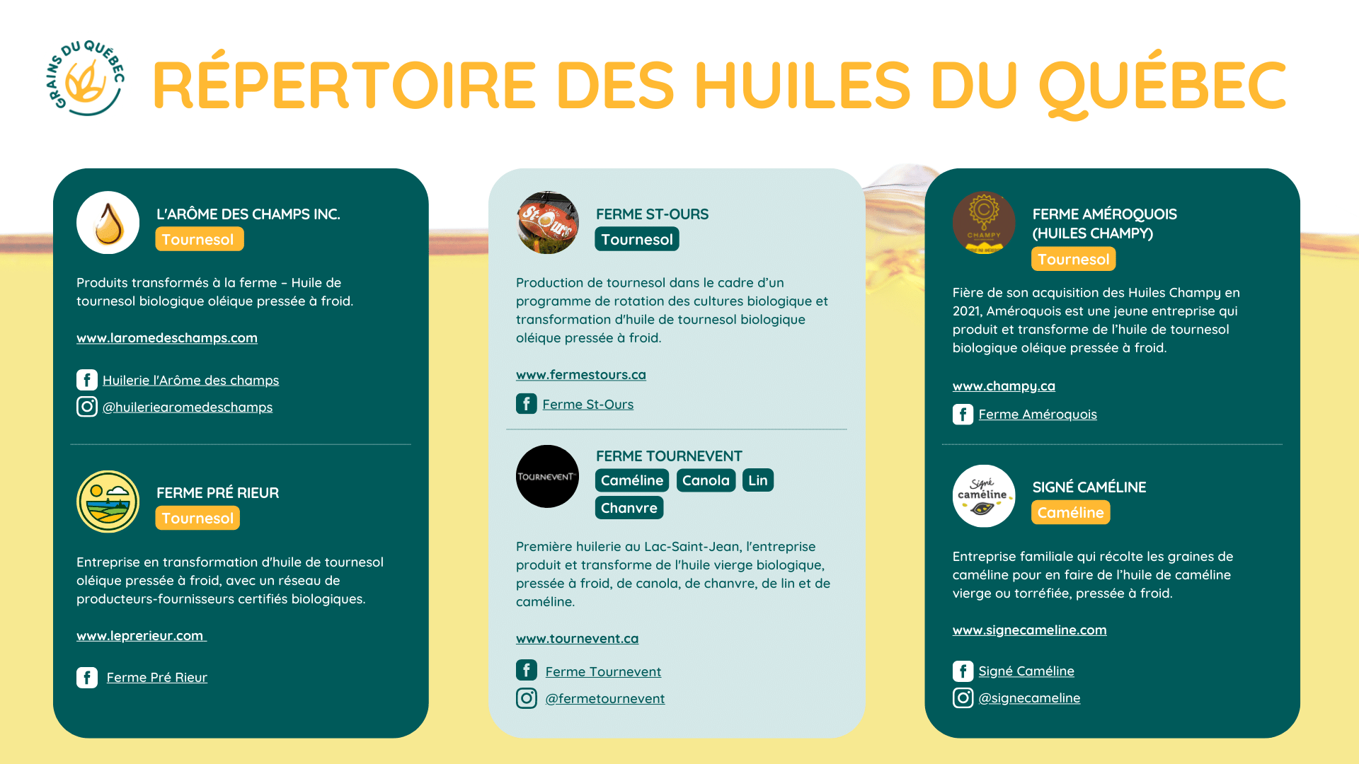 Afin d'encourager la consommation de ces huiles locales, les Producteurs de grains du Québec (PGQ) ont voulu les faire connaître davantage. Finalement, plusieurs producteurs d’huiles végétales québécoises se sont alliés afin de vous faire connaître leurs produits à base de grains du Québec. Ainsi, les PGQ vous présentent leur répertoire des huiles du Québec :