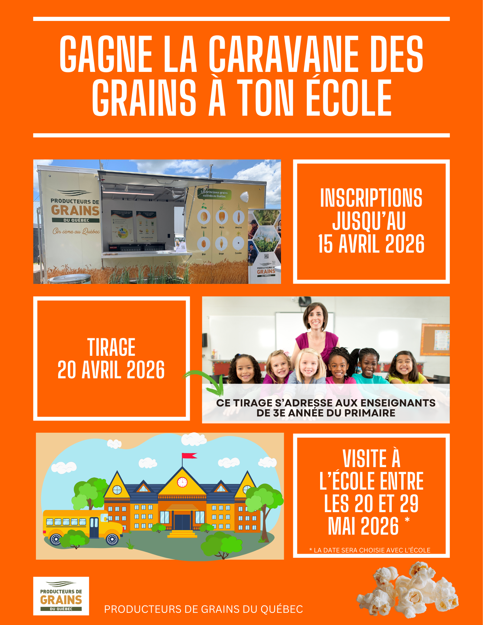 Nous vous offrons la possibilité de recevoir gratuitement la Caravane des grains des Producteurs de grains du Québec dans VOTRE COUR D’ÉCOLE!